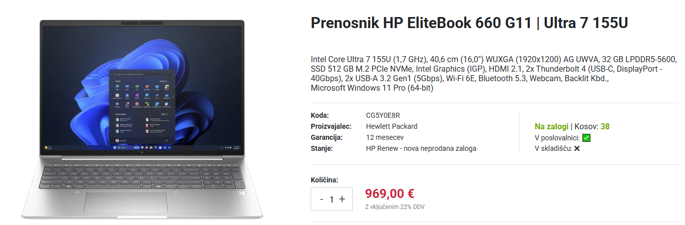 HP EliteBook 660 G11 je po našem mnenju izjemno dobra izbira v razredu poslovnih prenosnikov. Ob ceni 969 € (DDV vključen) za konfiguracijo z Intel Ultra 7 procesorjem in 32 GB RAM-a smo prepričani, da ugodnejše ponudbe na trgu praktično ni.