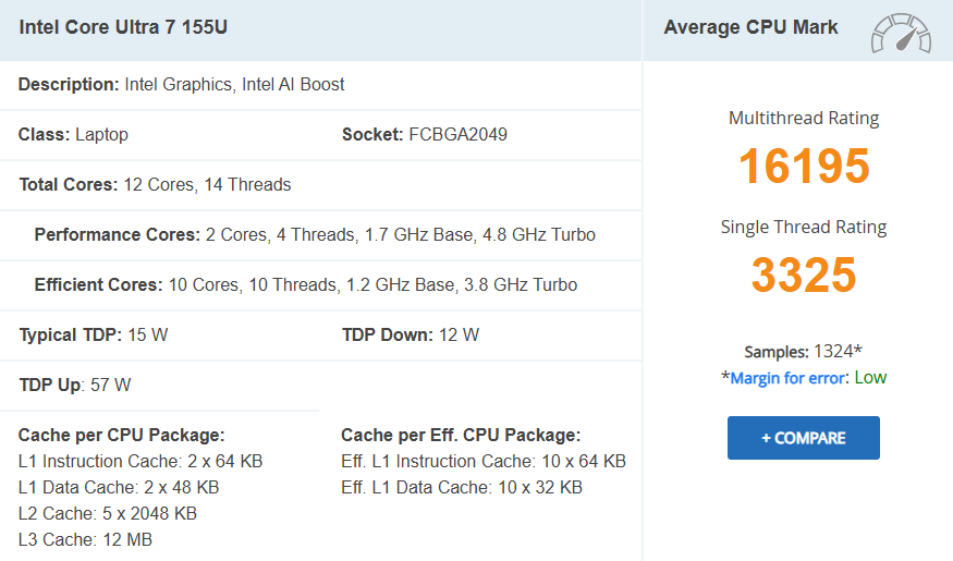 V prenosniku se nahaja izjemno zmogljiv Intel Ultra 7 155U procesor, ki je odlična izbira za sodoben poslovni prenosnik. Opremljen je z 12 jedri, ki so razdeljena na 2 Performance jedri (za zahtevnejša opravila) in 10 Efficiency jeder (za energetsko učinkovito delovanje).
